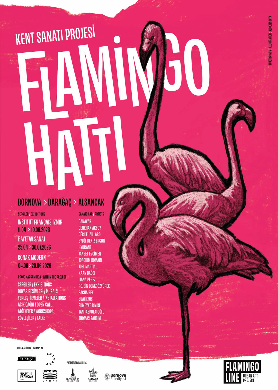 Bornova, Darağaç ve Alsancak’ta konumlanan Flamingo Hattı; sergiler, duvar resimleri, fotoğraf yerleştirmeleri, sokak yerleştirmeleri, atölyeler, açık çağrı programı ve film gösterimleriyle çok katmanlı bir sanat deneyimi sunuyor. Proje, yalnızca belirli mekânlarla sınırlı kalmayarak sokaklara, duvarlara uzandığı için gündelik kent yaşamının içine karışıyor. Flamingo Hattı, ekoloji etrafında şekillenen bir kültür mozaiği içinde kent hikâyelerine yeni katmanlar eklerken, şehir ile hafızanın iç içe geçmiş yapısına farklı bir bakış sunuyor.