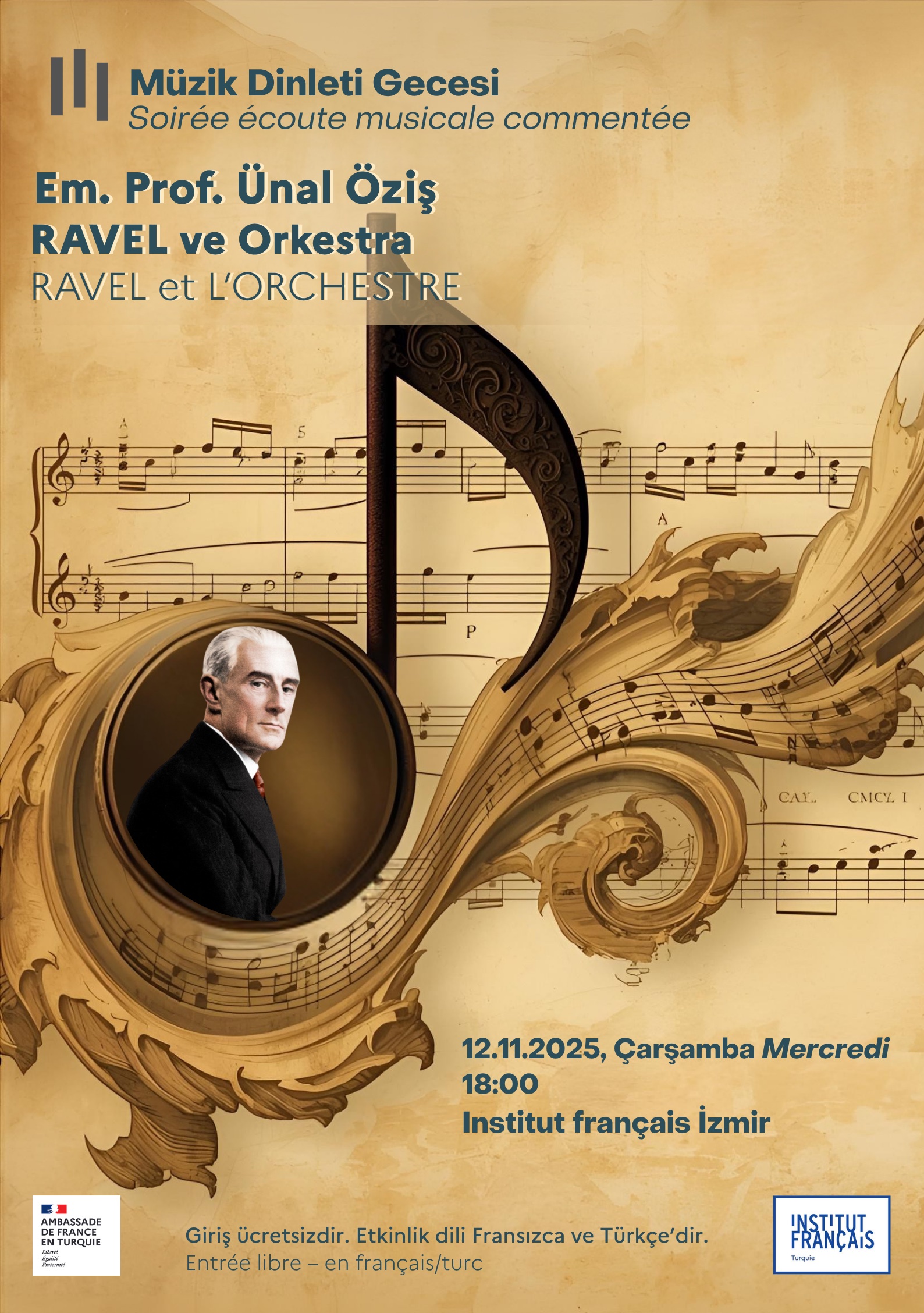 12 Kasım 2025 Çarşamba günü saat 18.00de Institut français İzmir’de Em. Prof. Dr. Ünal Öziş, Ravel’in en önemli müzik yorumları seçkisini sunacaktır: